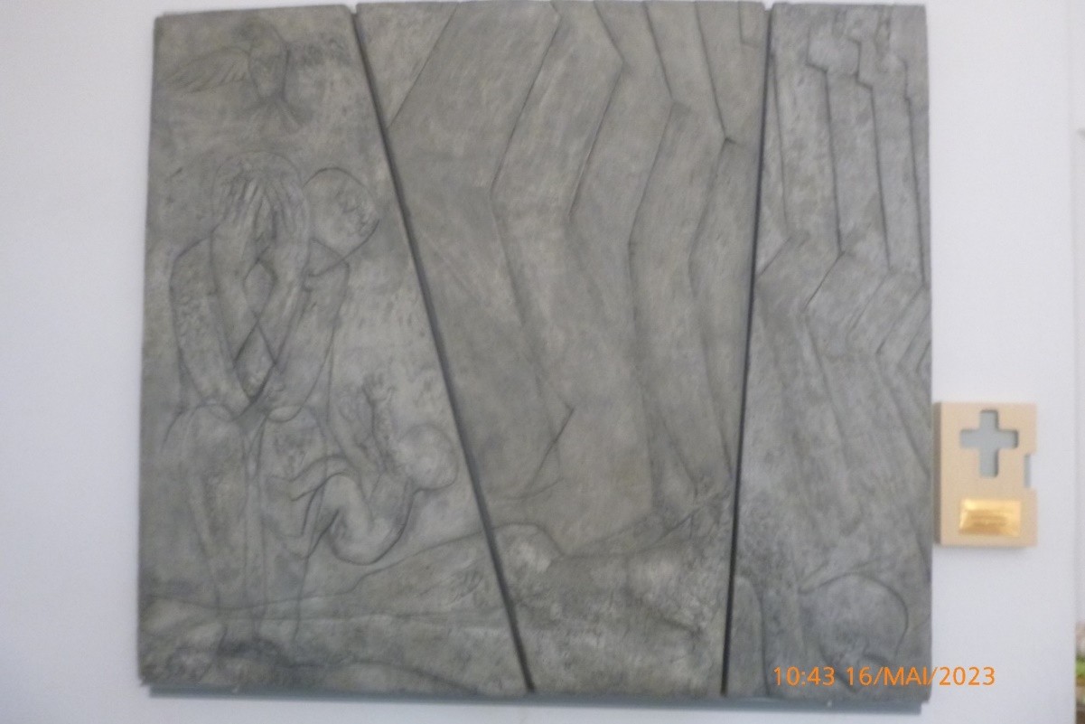 als Neuinterpretation für die hölzerne Gefallenen-Tafel wurde von Pfr. Fasching (2003-2008) angeregt. Die Namen der gefallenen Soldaten bleiben in einem Gedenkbuch erhalten. Das Neues Betonrelief von Frau Angelika Rattay (*1974) wird im Nov 2008 beim Turmaufgang montiert und im Rahmen der Kirchenrenovierung 2016 an den Ort der alten Kanzel verlegt. Die Grundidee war, allen Opfern des Krieges, nicht nur den Soldaten, ein gemeinsames Denkmal zu widmen, welches alle Folgen eines Krieges darstellt. Das Relief wurde zunächst in Ton geformt und mit Hilfe eines Gipsabdruckes (Negativbild) in Weiß-Beton gegossen.